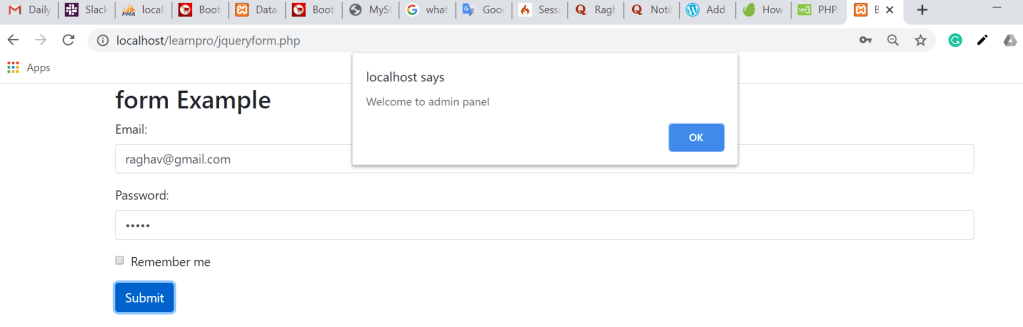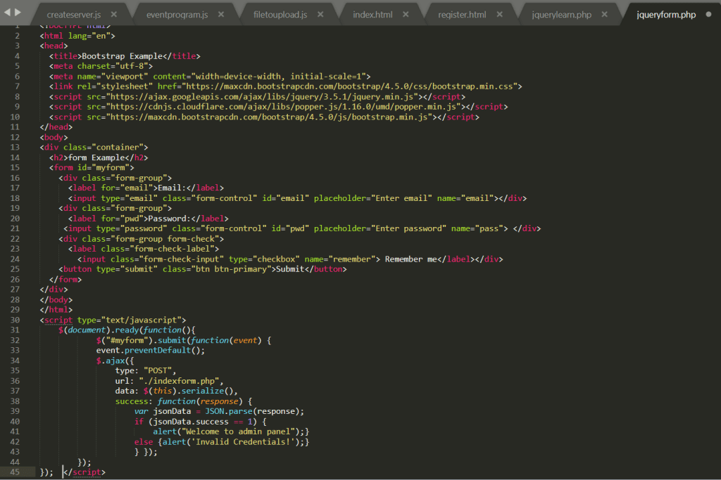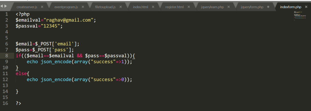 in the above indexform.php file we are verifying username and password and if matches are correct return JSON response as an array with value 1 and return JSON response 0 if matches are not correct.